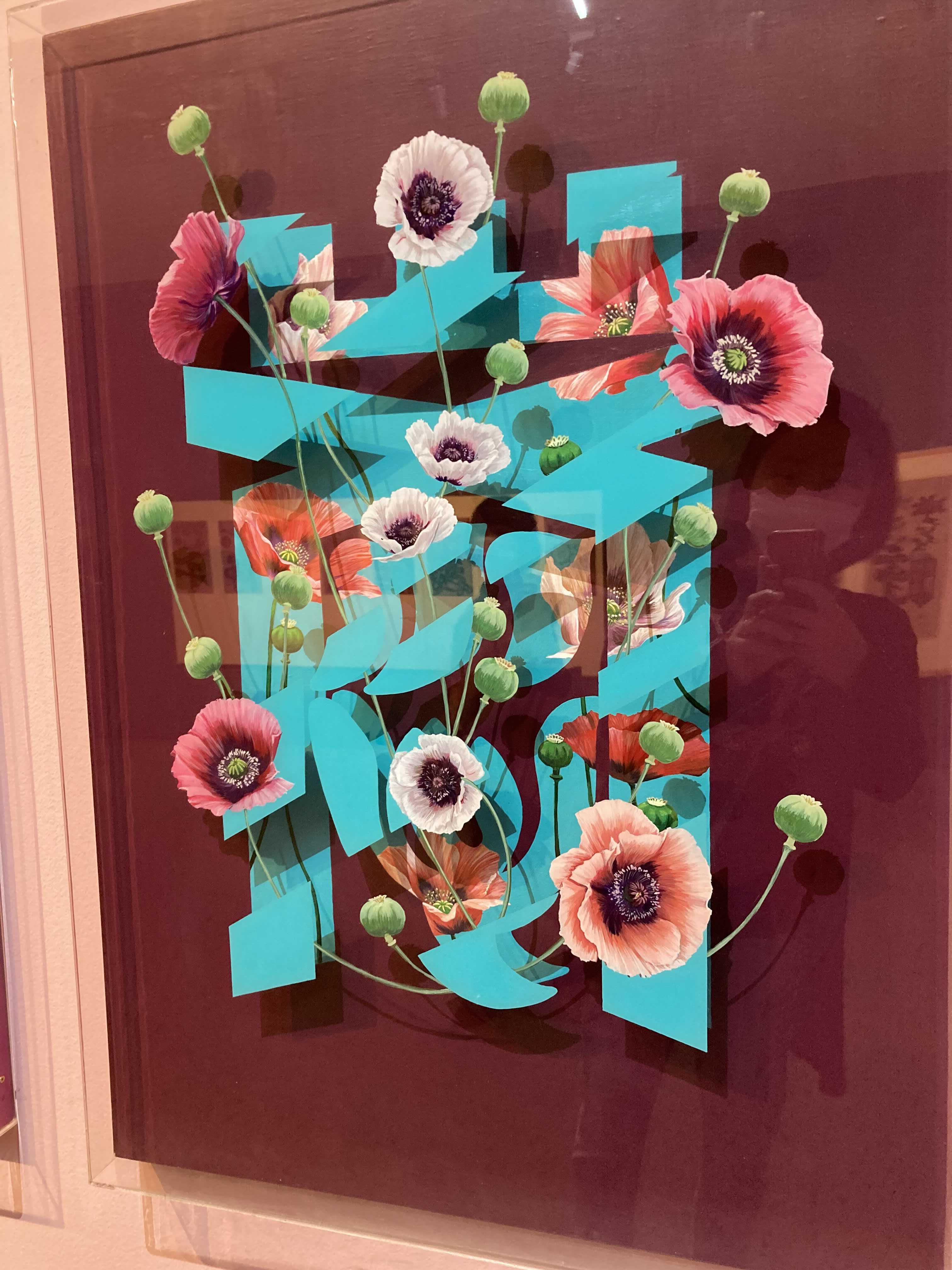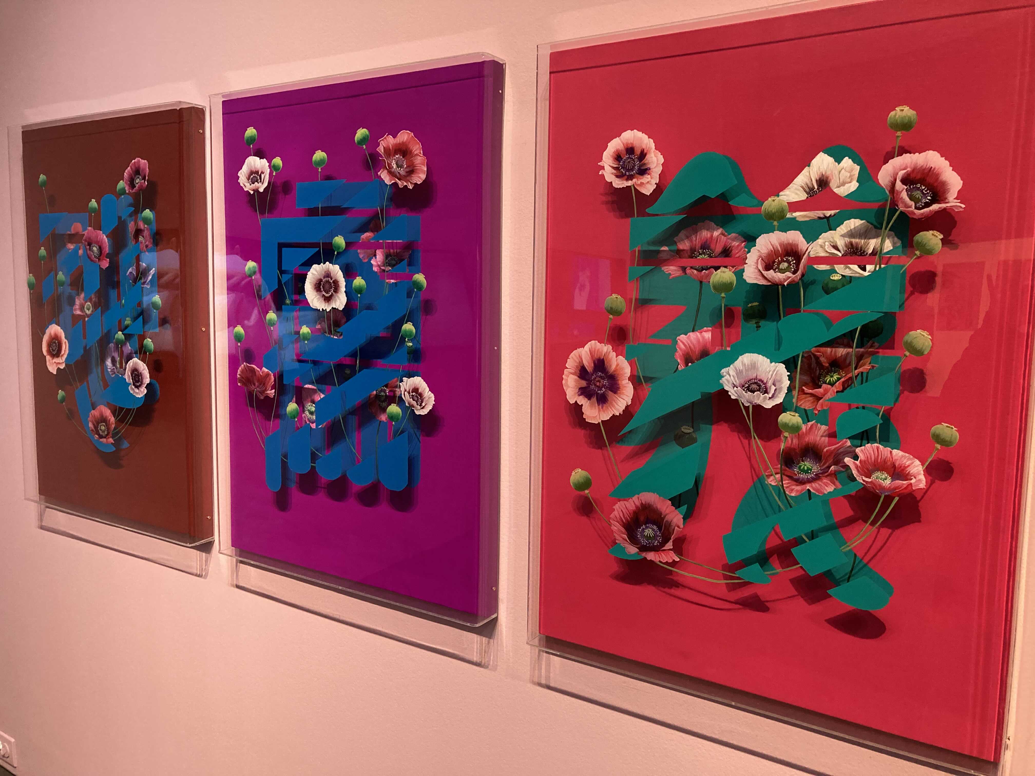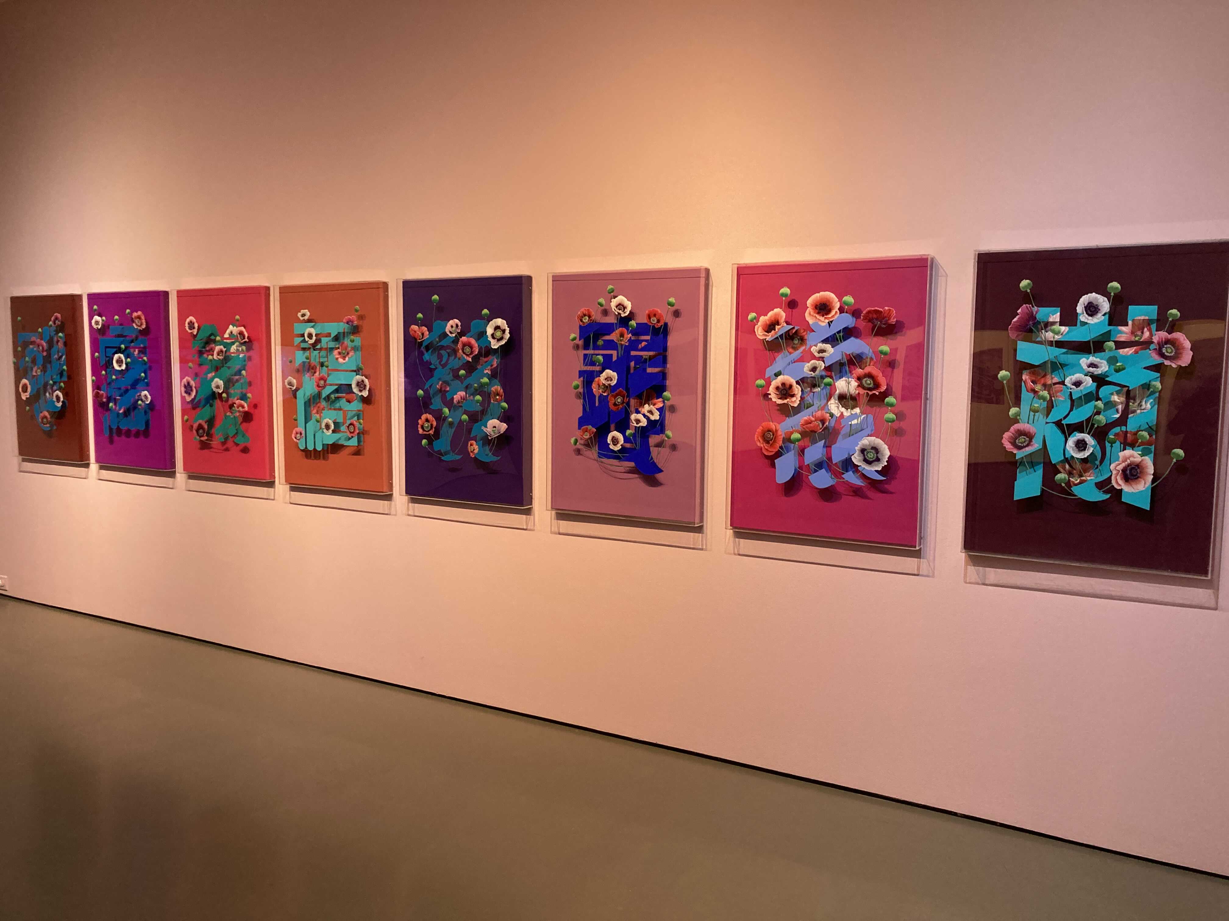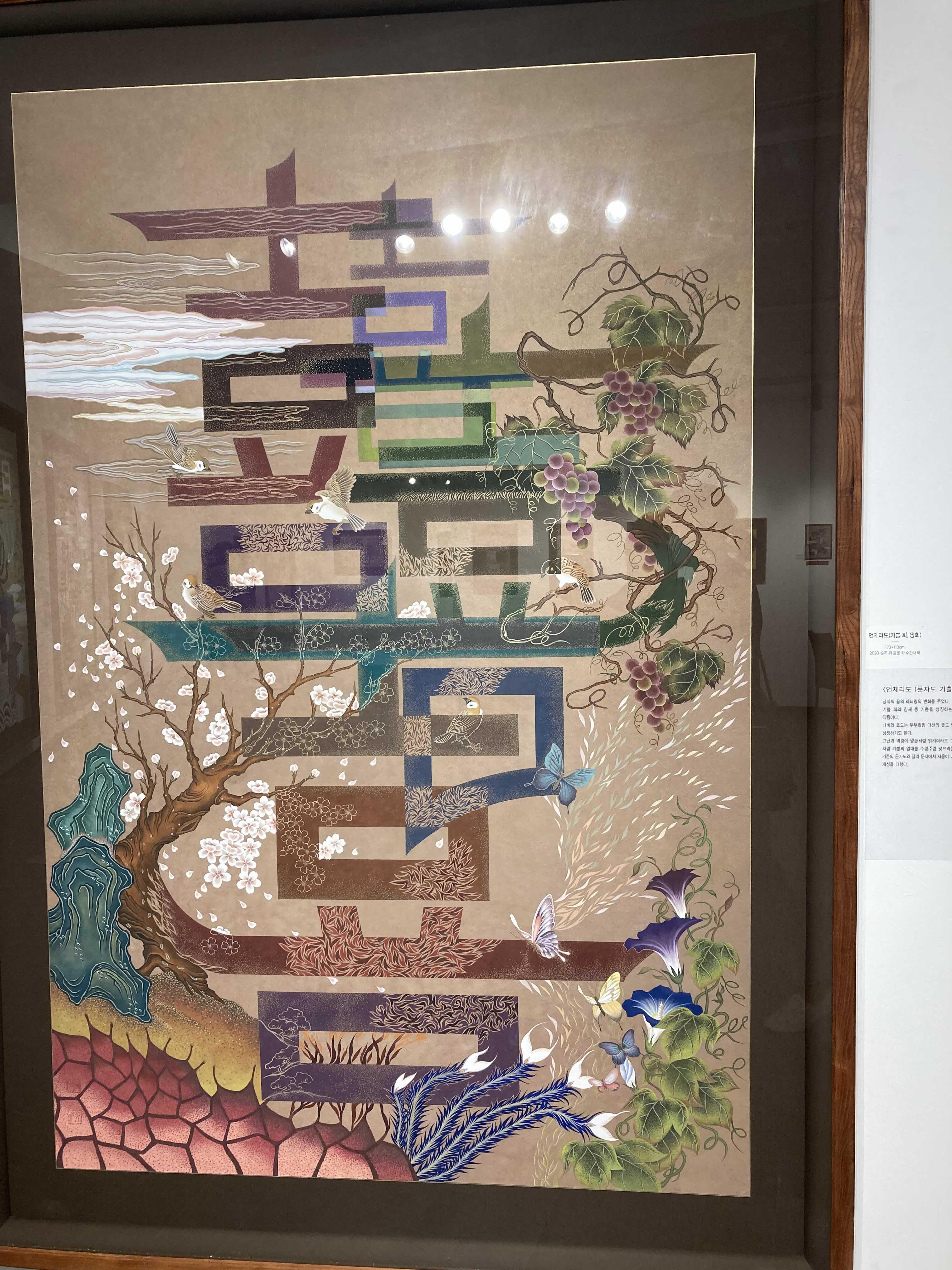 신제현 작가님의 작품도 매우 세련되어 놀랐어요. 제가 추구하고 싶은 느낌이랄까요. 한자권에 한자를 많이 쓰는 중국이나 일본에서는 한자를 활용한 다양한 문자도 작품들이 있어요. 세련되고 현대적인 느낌으로 그냥 일러스트 같은 느낌이 많아서 많은 사랑을 받는 모습이 부럽더라고요. 한자뿐만 아니라 한글을 활용해서도 그런 느낌을 내는 작품을 언젠가 해보고 싶어요. 같이 전시회를 간 언니도 자극을 받으셨는지 민화 선생님께 문자도를 배울 수 있느냐고 물으시더라고요. 히히 저도 언젠가!