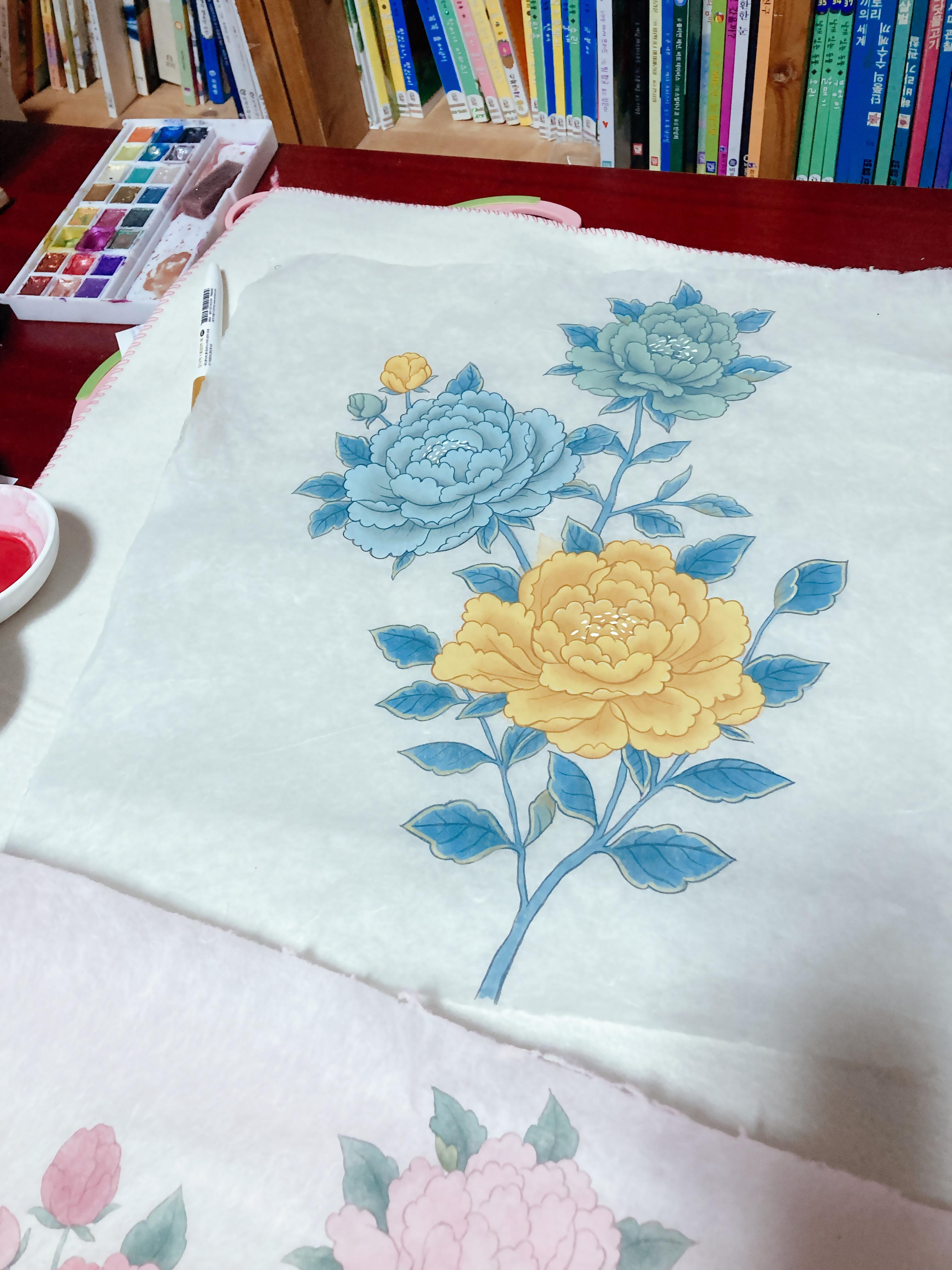 색이란 게 조합을 잘했다고 해도 막상나오는게 너무 다르네요. 바닥색하고도 스며드는 게 다르고 물양에 따라서도 다르고요. 바림을 하면 또 달라지죠. 그게 민화의 매력인 것 같네요. 같은 본이라고 해도 결과 값이 마냥 같을 수가 없으니까요. 숙련자의 선과 초보자의 선도 다르고요.