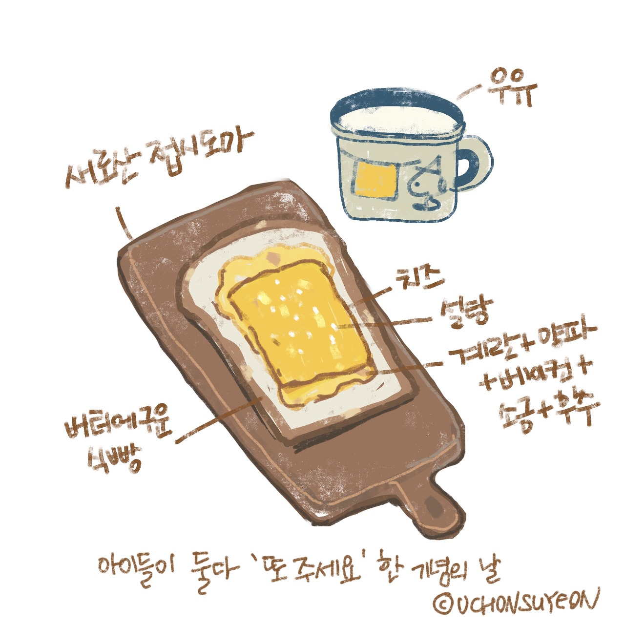 두 따님들의 식성이 각기 달라 아침마다 3종류 이상의 음식을 만듭니다. 뭐 특별한 건 아닌고, 큰 애가 베이컨+계란을 먹는다면, 둘째는 식빵에 치즈를 올려 토스트로 굽는 거죠. 혹은 큰애가 식빵에 딸기잼을 먹으면 둘째는 밥에 김을 싸 먹어요. 남편은 대세를 따르고 저는 식빵에 다른 걸 넣어먹으니 아침마다 여러 종류의 결과가 나온답니다.