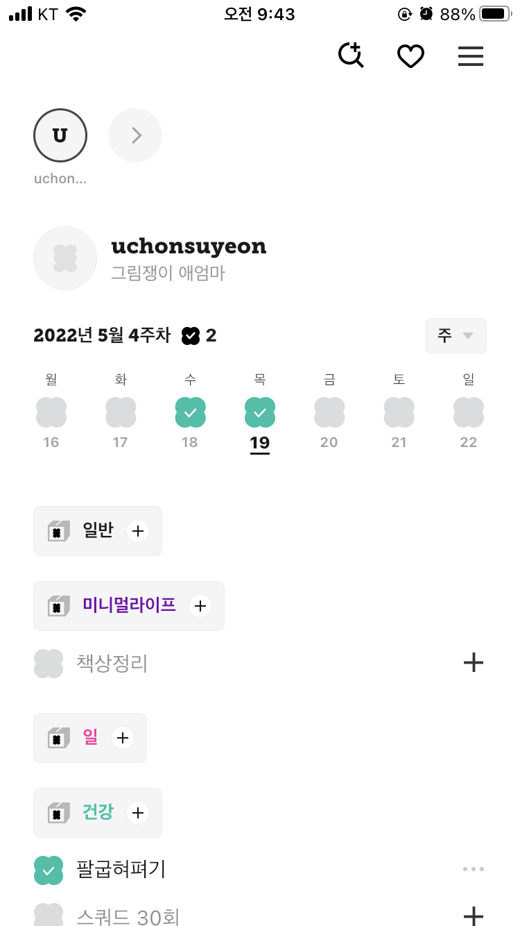 다만, 각각의 항목의 달성도가 뜬다던가 하면 좋겠어요. 어쩜 있는지도 모르겠지만요. 깔끔한 만큼 기능을 좀 찾아서 써야 하더라고요. 그냥 메인창에서 할 일 추가할 때 '매일할 건지, 아닌지' 설정하면 될 텐데, 그게 안돼요. 그런 장단점이 있어요.