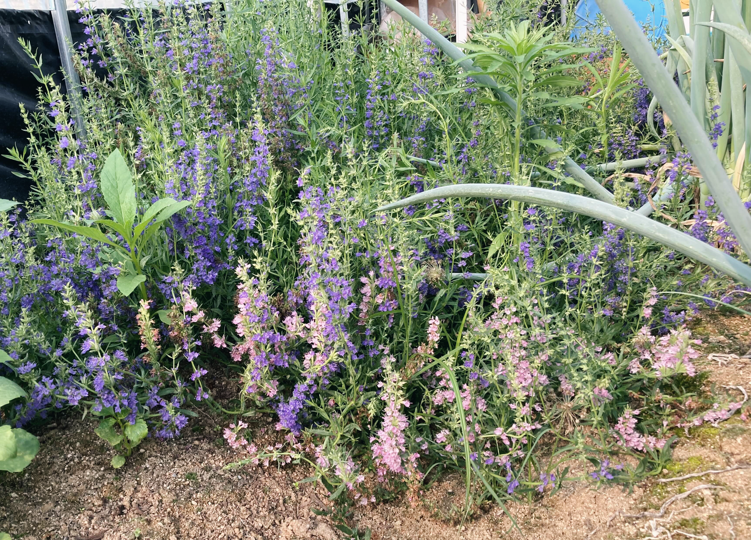 비닐하우스의 2년차 식물 히솝입니다. ㅎㅎ 별거 안해줘도 매우 잘자라네요. 여자에게 좋다고 해서 차로 덖은 후 다른 허브들과 브랜딩해 먹었었답니다. 올해는 왜인지 허브차를 덖을 마음이 생기지 않아서 지켜보고만 있어요. 그런데 어느새 이렇게 분홍과 보라색꽃이 피었어요. 제법 근사하지요?