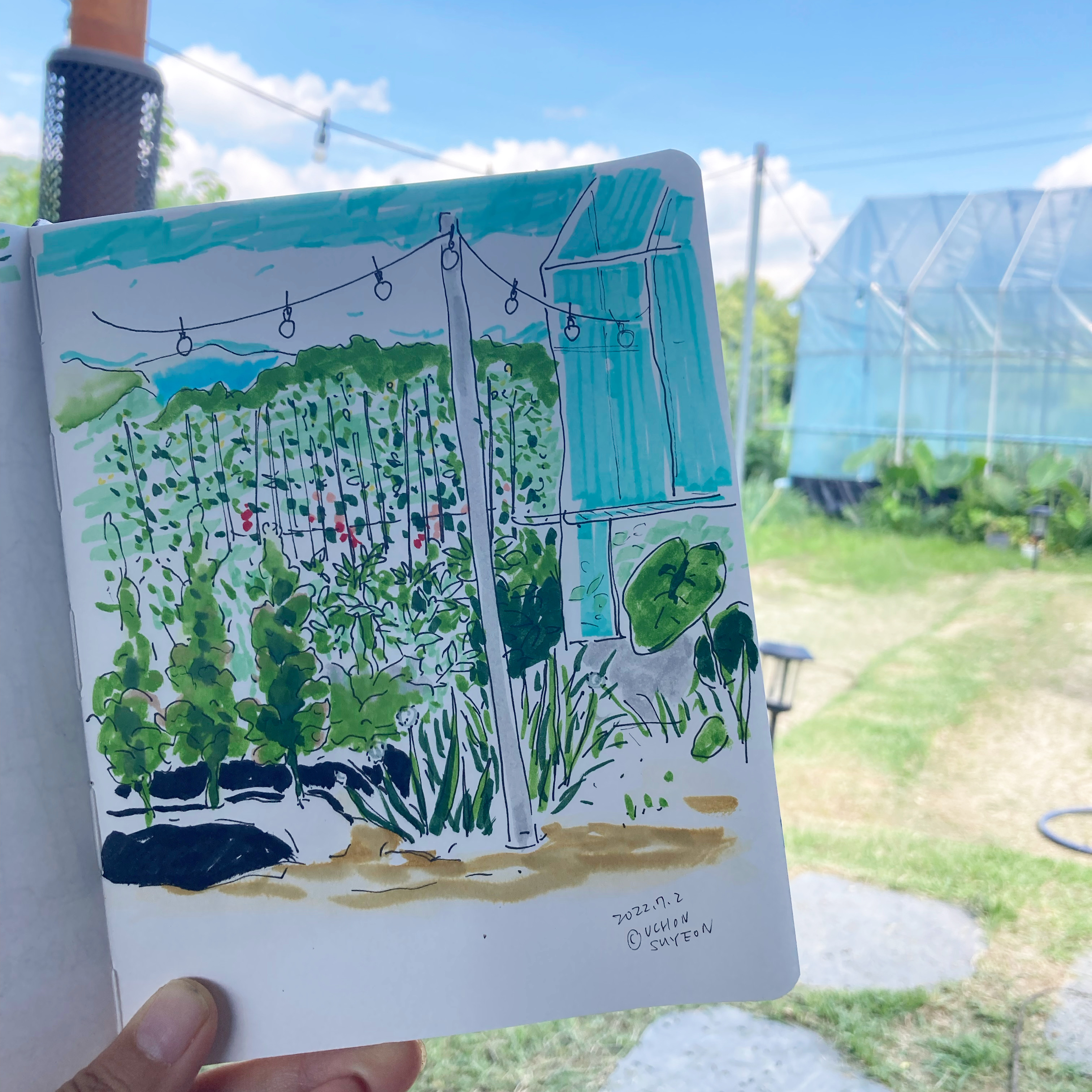 그림 재료를 부족하게 갔더니 색이 부족해서 하늘색은 형광펜이에요. 늘 후회하는 거지만, 좀 더 열심히 그릴껄 하는 거죠.