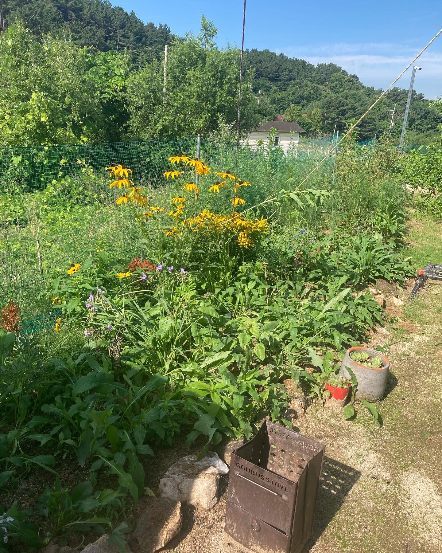비가 오고 내리면서부터 식물들이 잘 자랄걸 알고 있었지만, 한주를 빼먹었더니 정글이 되었더라고요. 초당옥수수는 제 키보다 높아서 건너산이 간신히 보일 정도였어요. 역시 옥수수는 비료빨이네요. 여름이 다가오기 전까지 벌들이 잘 안 보였는데, 옥수수 꽃이 피니까 엄청난 벌들이 윙윙거리며 날아다니고 있어요. 무서워서 근처도 못 갔어요.