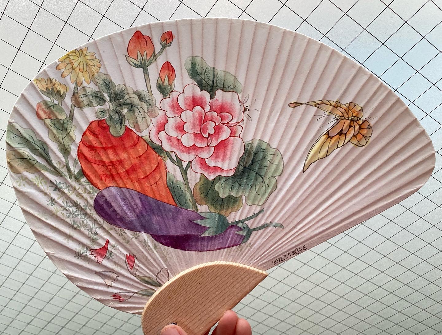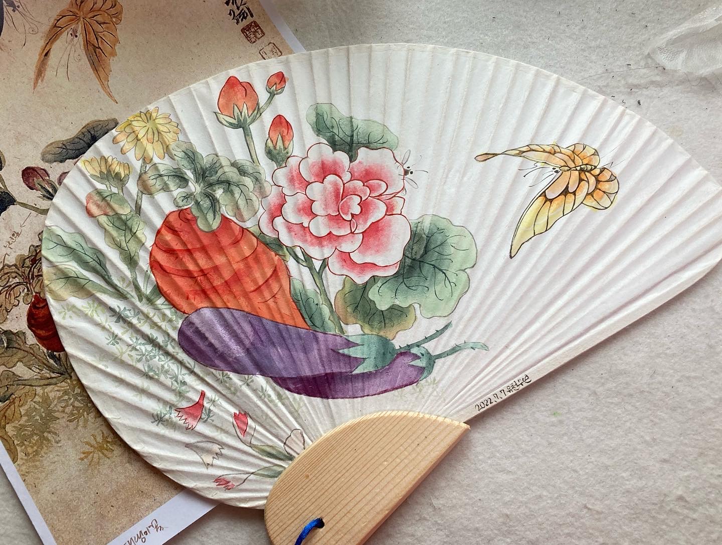 다만 포수가 잘되지 않아서 선을 넣는 것부터가 잘 안되더라고요. 울퉁불퉁해서 그렇기도 하고요. 에라이 모르겠다 그러고 막그렸더니 뒤로 갈수록 날림이였지요. 이대로 관둘까하다 그냥 순수하게 부채로나 쓰자해서 채색까지 했네요. 역시나 포수가 잘되지 않은 부분은 물감이 번져버리고 바인더가 뭉친 곳은 채색이 들어가질 않네요. ㅎㅎㅎ 일단 부채부터가 저렴이라 부채살이 고르지가 않아서 연습용이라 하더라도 조금 실망감이 올라왔어요. 2차 고비... 또르르
