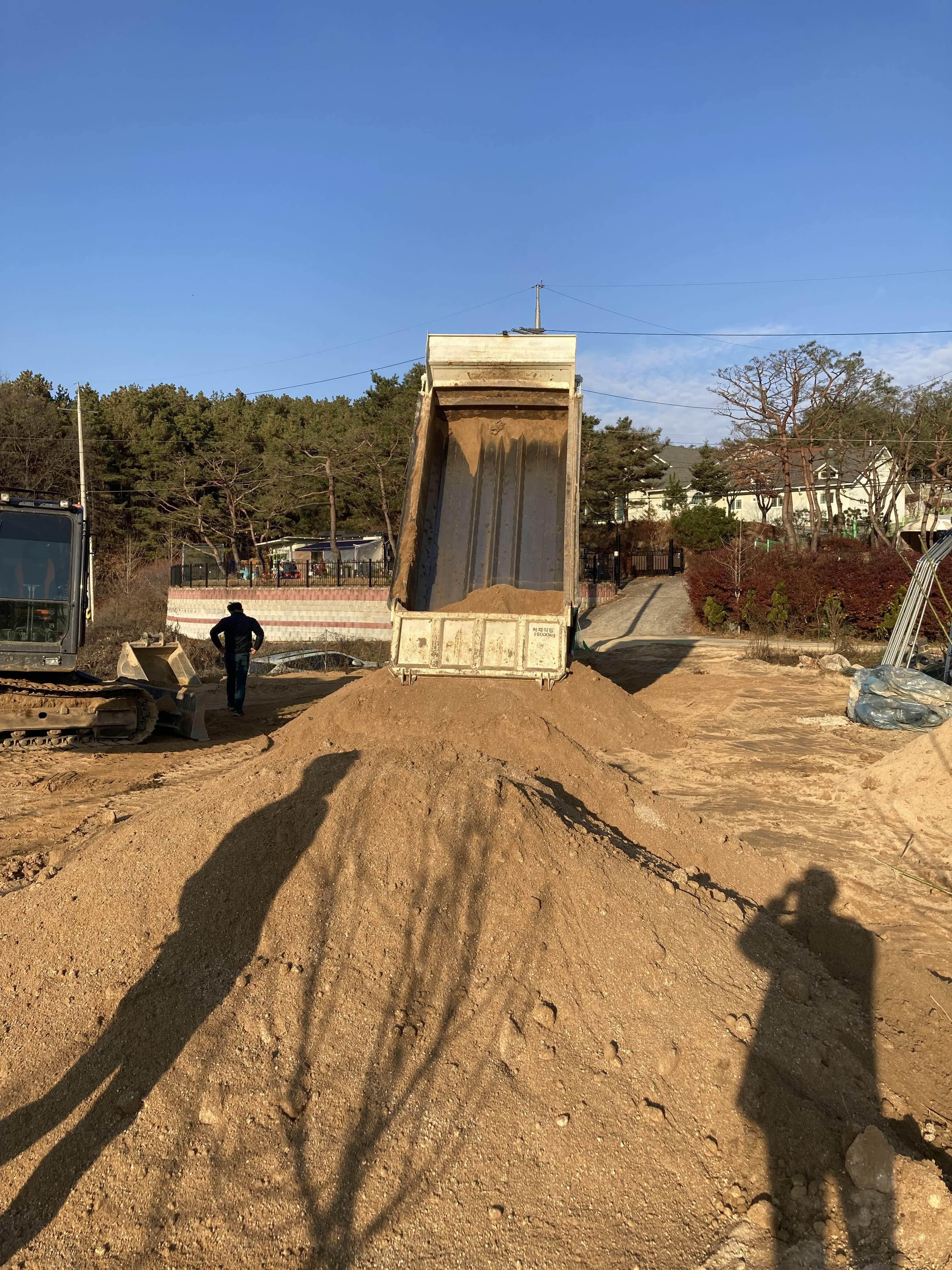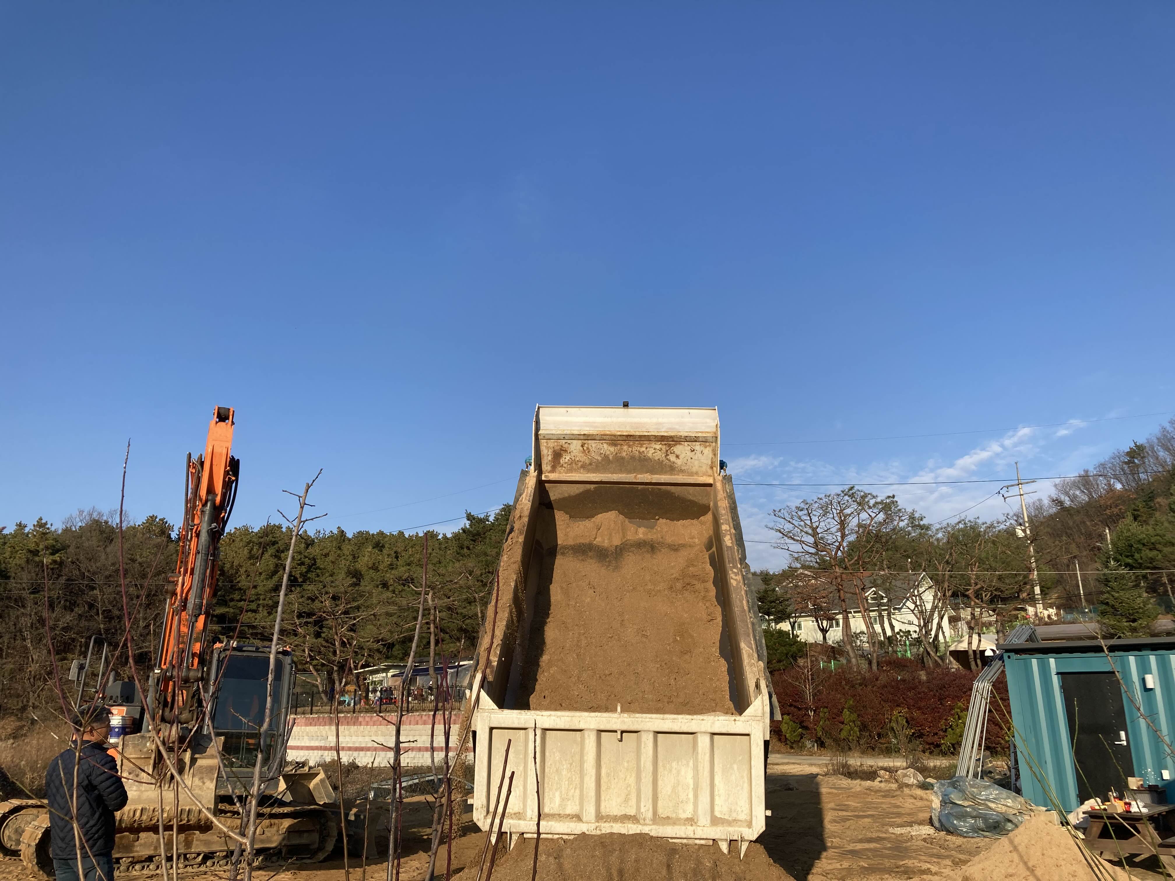 토목공사 마무리에 들뜬 나머지 마지막 흙차를 찍으면서야 하늘이 파란 걸 알았어요. 마지막 두 차의 흙을 붓고 있습니다. 양평 내에 흙이 없어서 횡성에서까지 가져오느라 흙 값만으로도 많이 들어갔어요. 아깝지만 어째요. 어차피 들어갈 거 ~ 그러려니 해야죠. 마이너스가 더더욱 깊어졌습니다. 허허