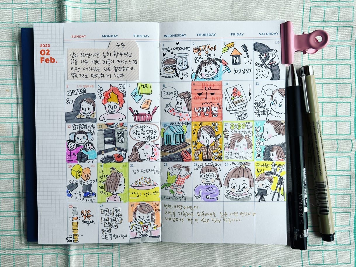 다이어리가 생겨서 하루그림일기를 그렸어요. 한장의 그림일기는 금방그리지만, 하루를 축약해야하니 고민 좀 해야하더라고요. 뒤에 주간일기에는 좀 주저리 주저리 적어여. 글씨로 적어내면 하루가 알차고 고민도 일기장으로 넘어가더라고요. 계속 써내려가다보면 나는 고민 1g도 없는 사람이 될 것 같아요. ㅎㅎ