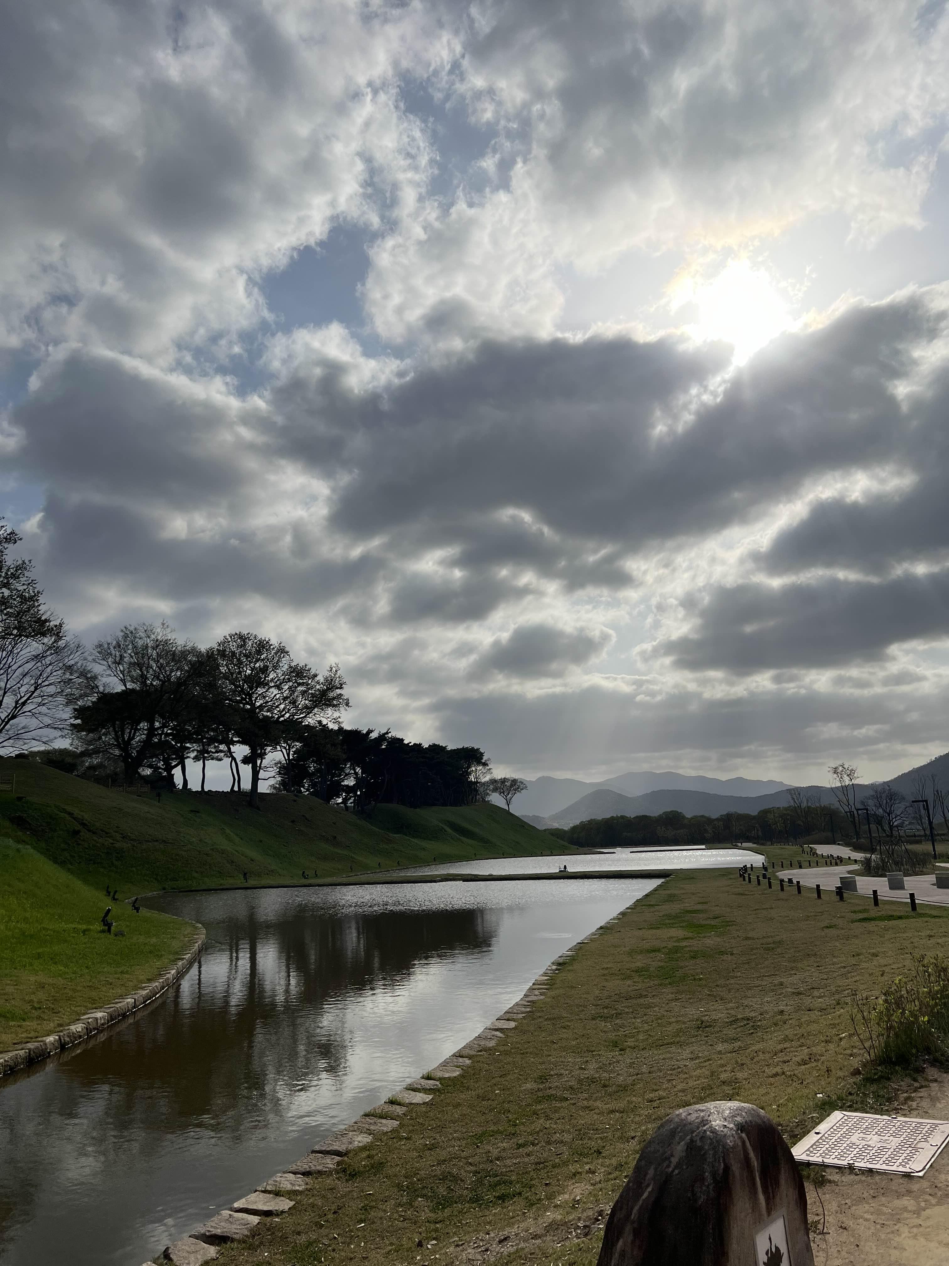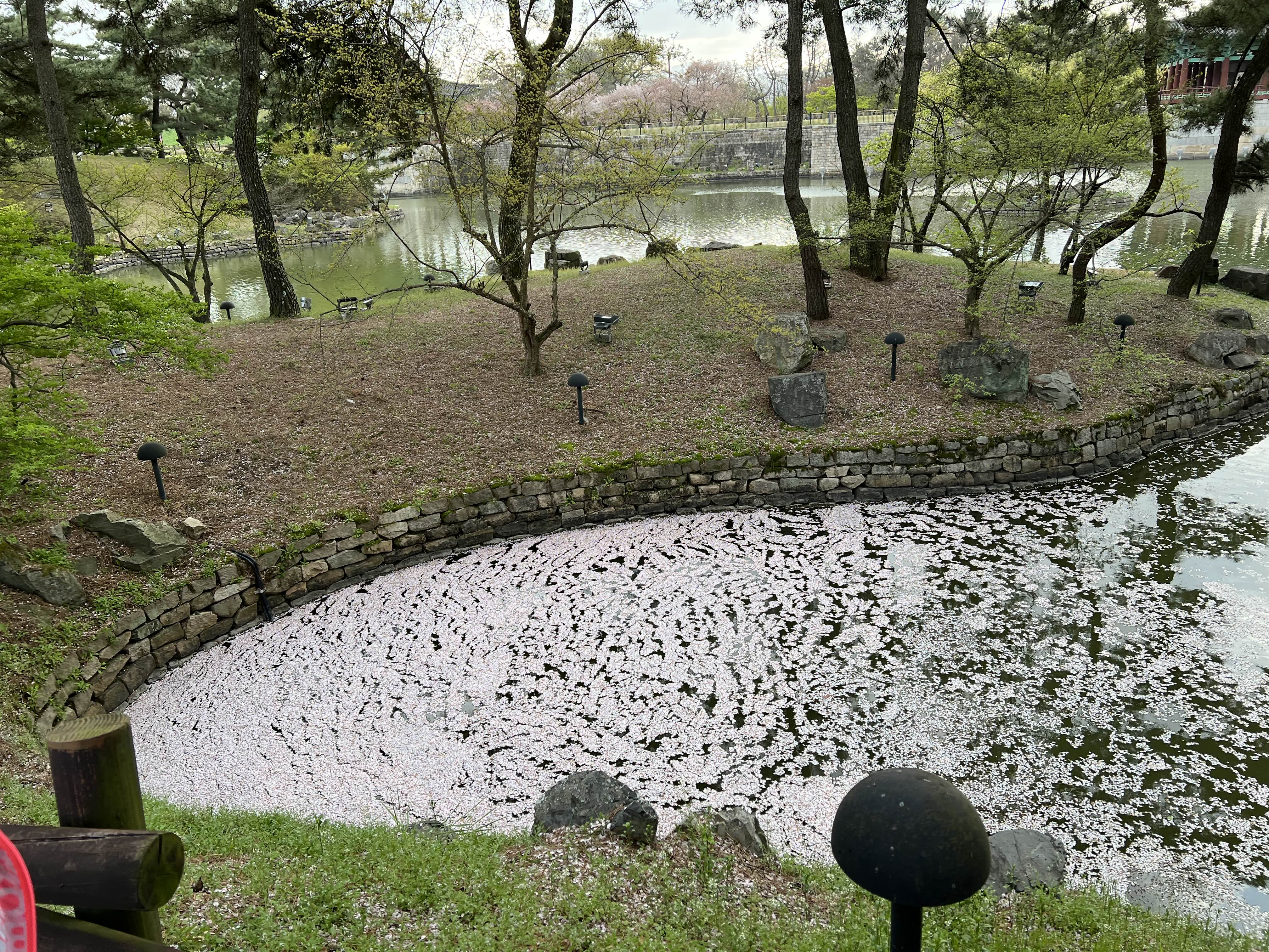 원래 동궁과 월지는 밤에 와야하는데, 6시 반까지 기다릴 수가 없어서 그냥 둘러보기로 했습니다. 낮에 오는 건 처음인데, 사람도 별로 없어 산책하기는 좋더라고요. 벚꽃이 연못에 빠져 독특한 광경이었어요. 뭐.. 아무래도 야간이 아니다 보니 아름다움은 덜하지만 고즈넉한 분위기는 좋아요.