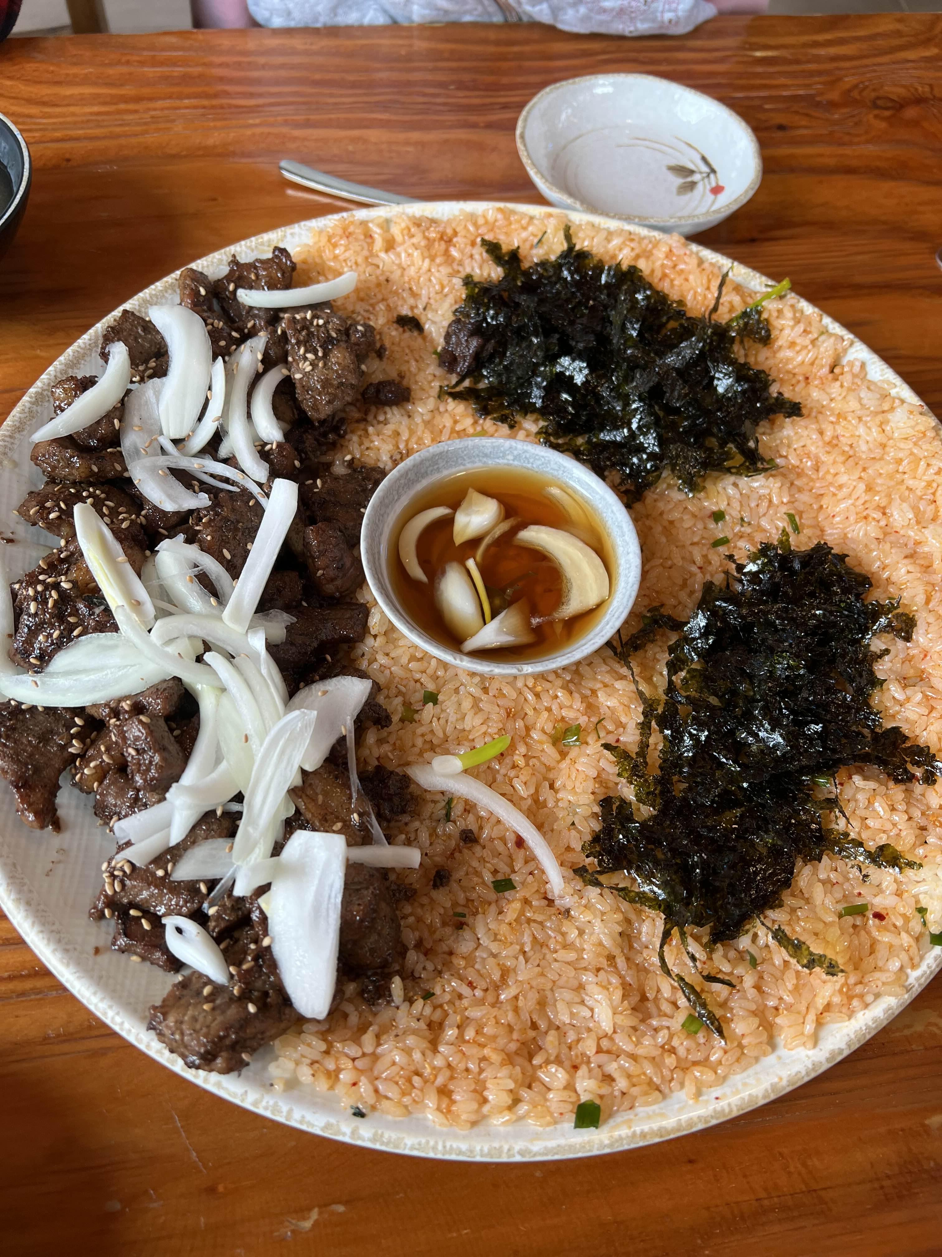 식사를 떡갈비를 먹자고 찾다가 황남비빔밥이 있길래 찾아왔어요. 밥이 비벼져서 나와요. 단짠이고 먹을 만했어요. 치즈 떡갈비도 여자입에 잘 맞아요. 갈비 비빔밥은 2~3인분이라고 하던데 어른 둘에 애 하나 정도가 잘 맞는 것 같아요. 밥과 치즈떡갈비를 따로 시켰는데, 밥에 깨도 뿌려져 나오고 여기 카페 같은 분위기예요.