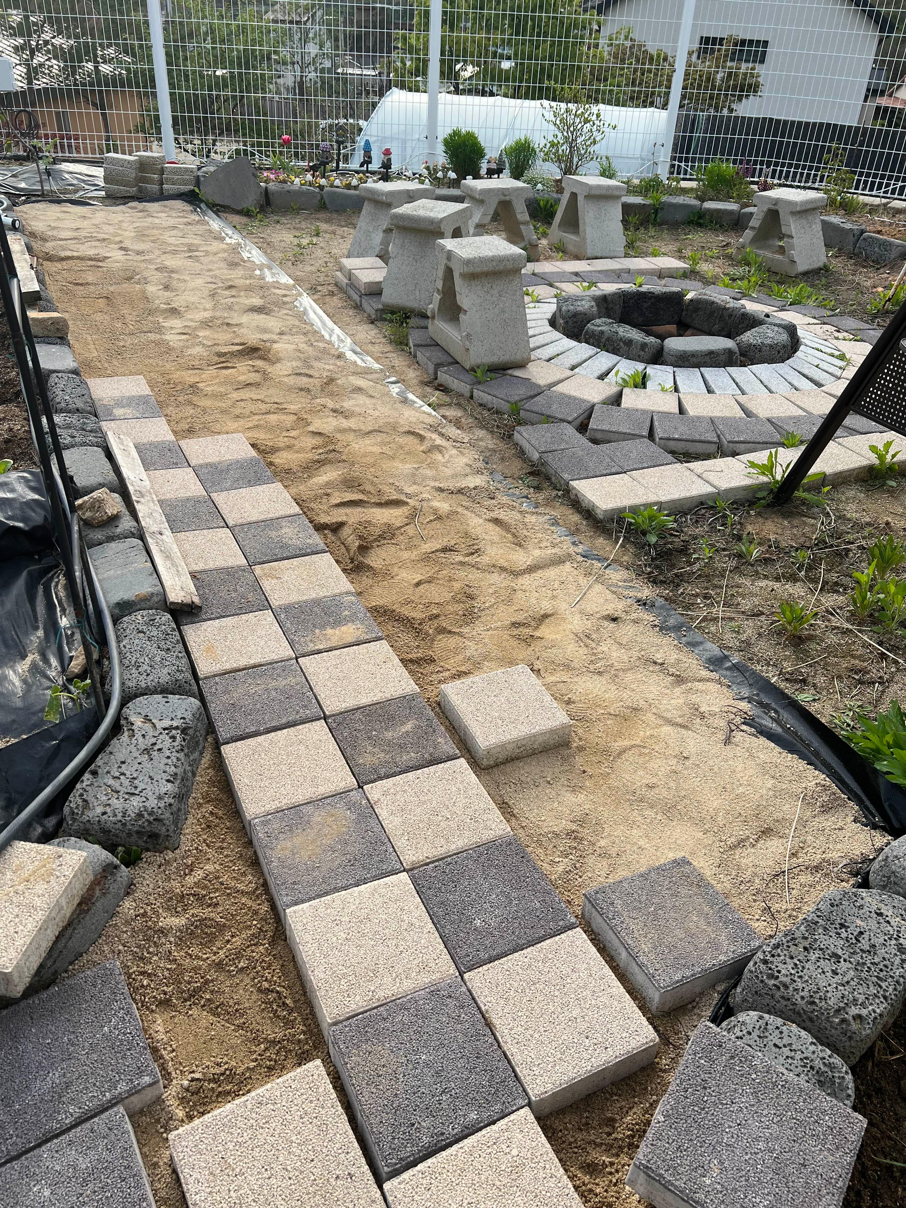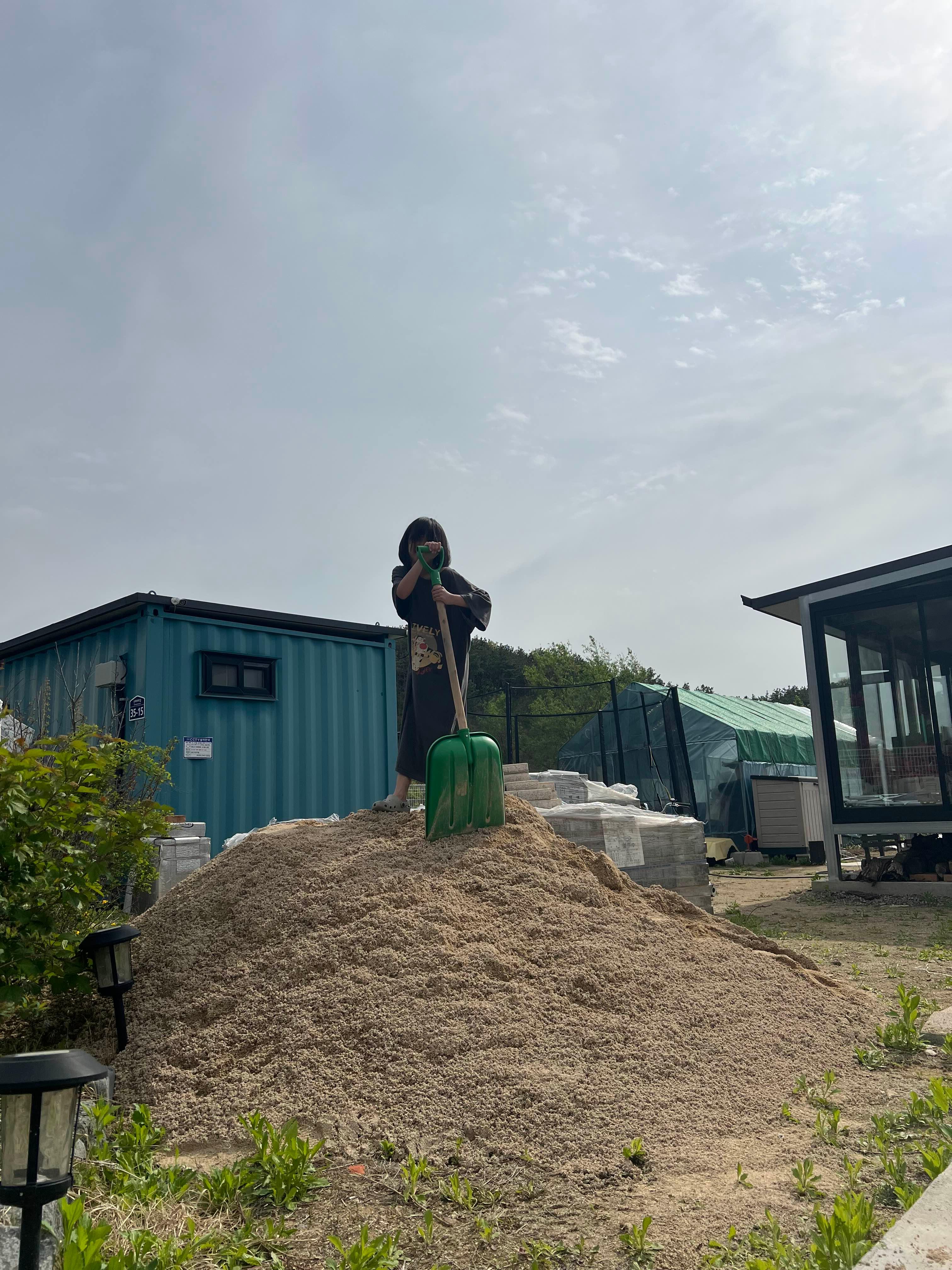 모래를 한트럭 시켰습니다. 결국! 주차장쪽에 쏟아둔 모래를 조금씩 정원쪽으로 옮기고 있어요. 잡초를 없애기 위해 ! 비닐깔고 모래깔고 보도블럭을 깝니다. 하앍하앍. 언제가 다 하겠죠.