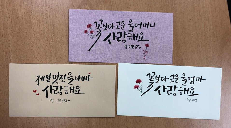 이렇게 발전하는 나의 손글씨를 보니 정말 뿌듯하다. 이제는 내 글씨가 부끄럽지 않아서 좋고, 연습한 캘리그래피로 선물도 할수 있어서 좋다. 일 년은 꾸준히 할 생각이다. 작가나 선생님이 될 정도로 해보려고 한다. 할 수 있다. 아자아자 ㅎㅎ