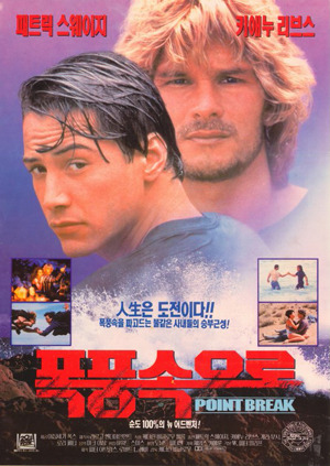 젊은 패트릭 스웨이지, 키아누 리브스가 나온다. 경찰과 범죄자의 우정과 서핑에 관한 영화이다. 큰 이야기 줄거리가 있는 건 아니지만, 서핑을 주제로 한 영화라 시원한 바다가 좋은 볼거리다. 그리고 제목처럼 폭풍 속으로 들어가는 주인공 패트릭 스웨이지와 그는 폭풍 속으로 들어가게 허락해주는 경찰관 키아누 리브스가 인상적이다. 1991년도에는 ‘서핑’이라는 주제는 무척 생소했다. 거기에 그런 결말이라 기억에 남는 작품이다. 폭풍이란 단어나 비라는 단어를 들으면 떠올려지는 작품이다. 영화의 색으로 보자면 남색빛이다. 남색빛 폭풍우와 파도속으로 들어가는 주인공의 모습이 이 영화에 대한 내가 갖고 있는 이미지다.