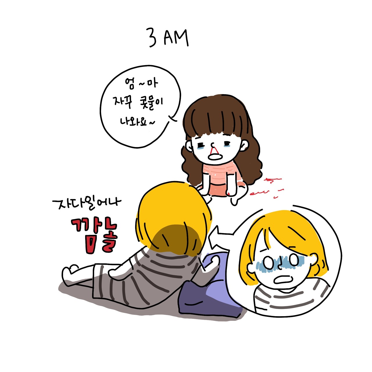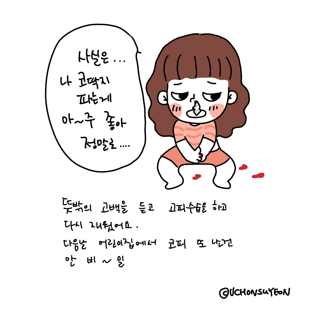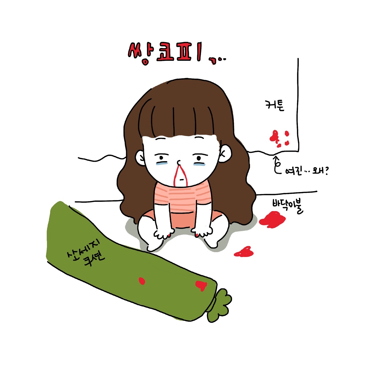 조이가 처음 코피를 좔좔 흘리던 때가 생각나네요. 저는 코피를 잘 안흘리는 편이라 깜짝놀라서 벌벌 거렸어요. 이제는 코피가 아무리 나도 지혈잘해주고 잘 재웁니다. ㅎㅎ