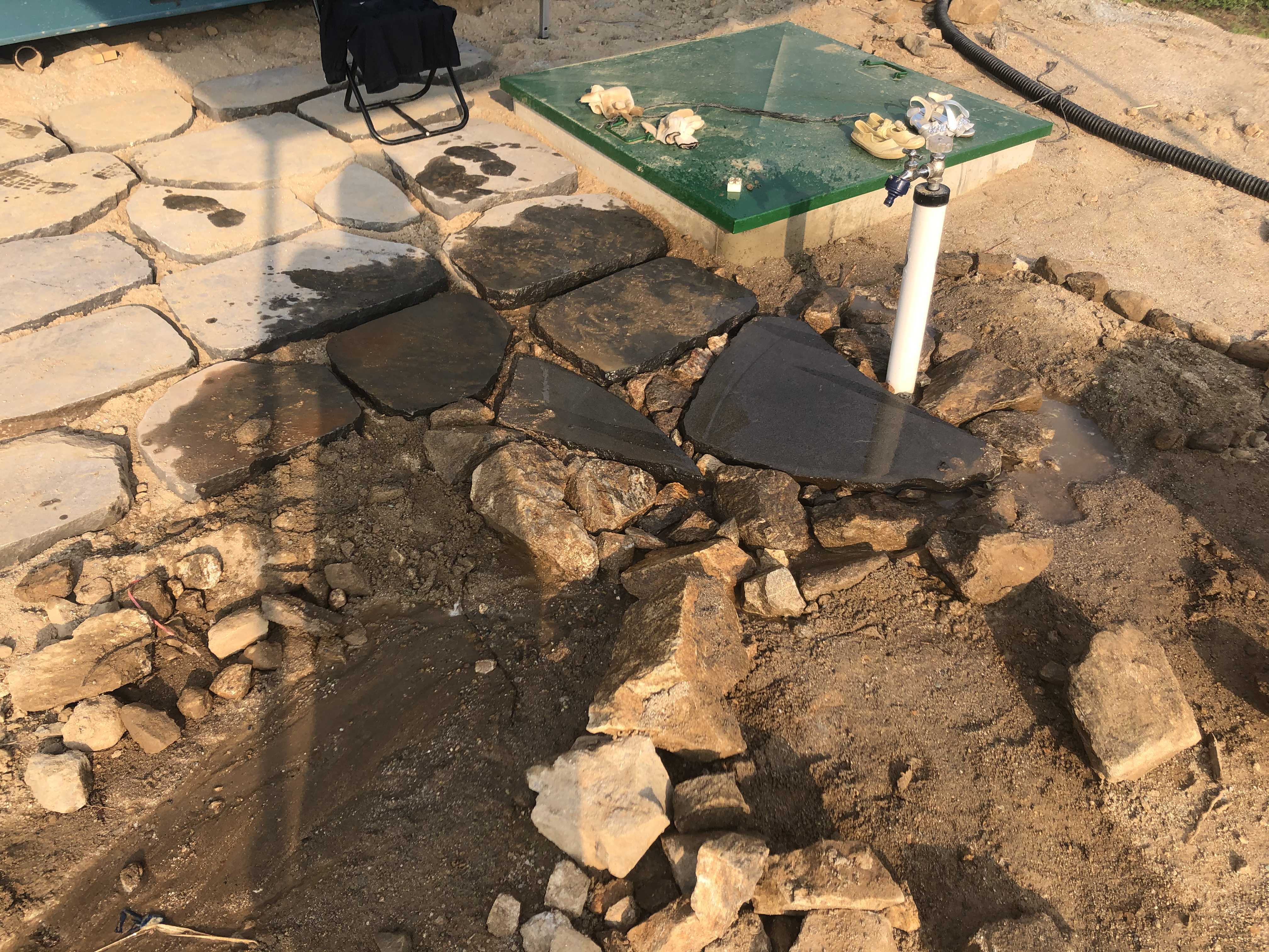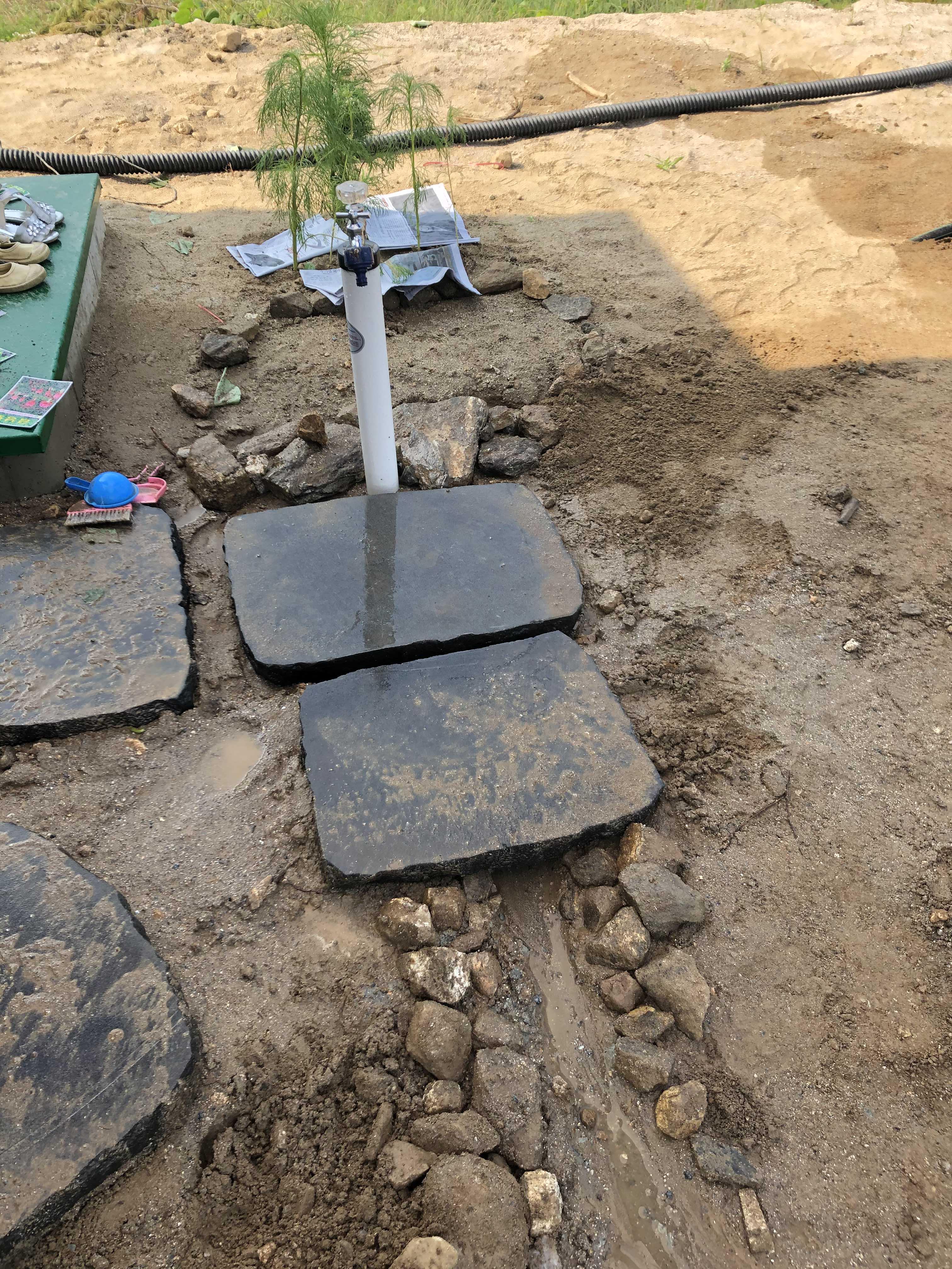 수전의 변천사다. ㅎㅎ 돌로만 깔면 빨래할 곳이 없어서 마침 깨진 디딤석이 있길래 중간 사진처럼 변형해서 바꾸어보았다. 그런데 자꾸 네모반듯하게!를 외치니 맨 오른쪽의 사진처럼 네모반듯한 애로 바꾸어주었다. 아랫쪽에는 물 내려가는 물길도 내주었다. 후훗. 점점 발전하는 듯? 역시 적성에 맞아보다.