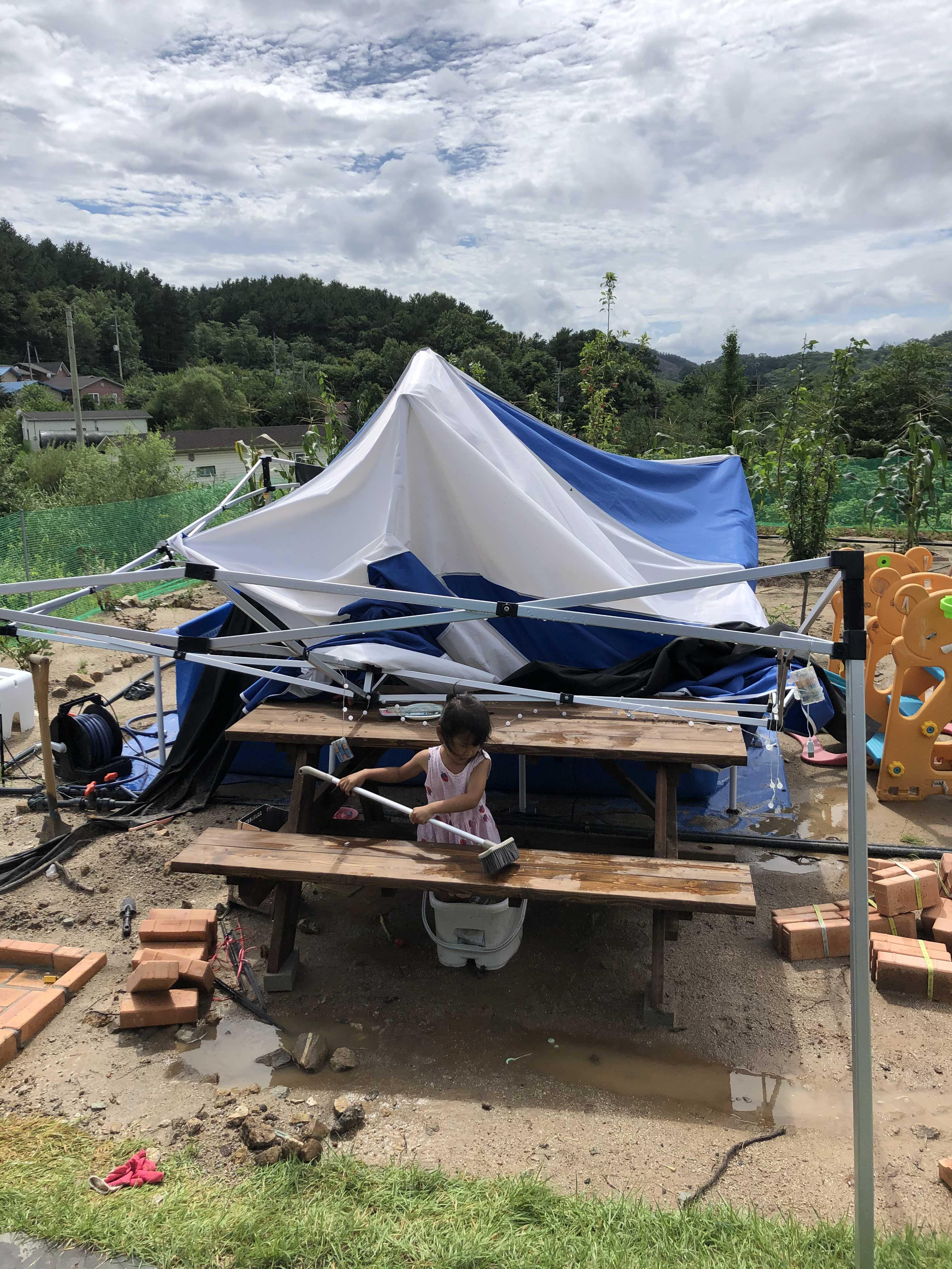 아. 예상을 넘어선 수해현장이 우리를 기다리고 있었다. 남편이 이틀의 휴가를 받아서, 이번 휴가엔 일하지말고 놀자라는 목표로 왔건만 이런 상황이였다. 일단 천막을 걷어내니 정말 가관이였다. 멀리서 보니 남의