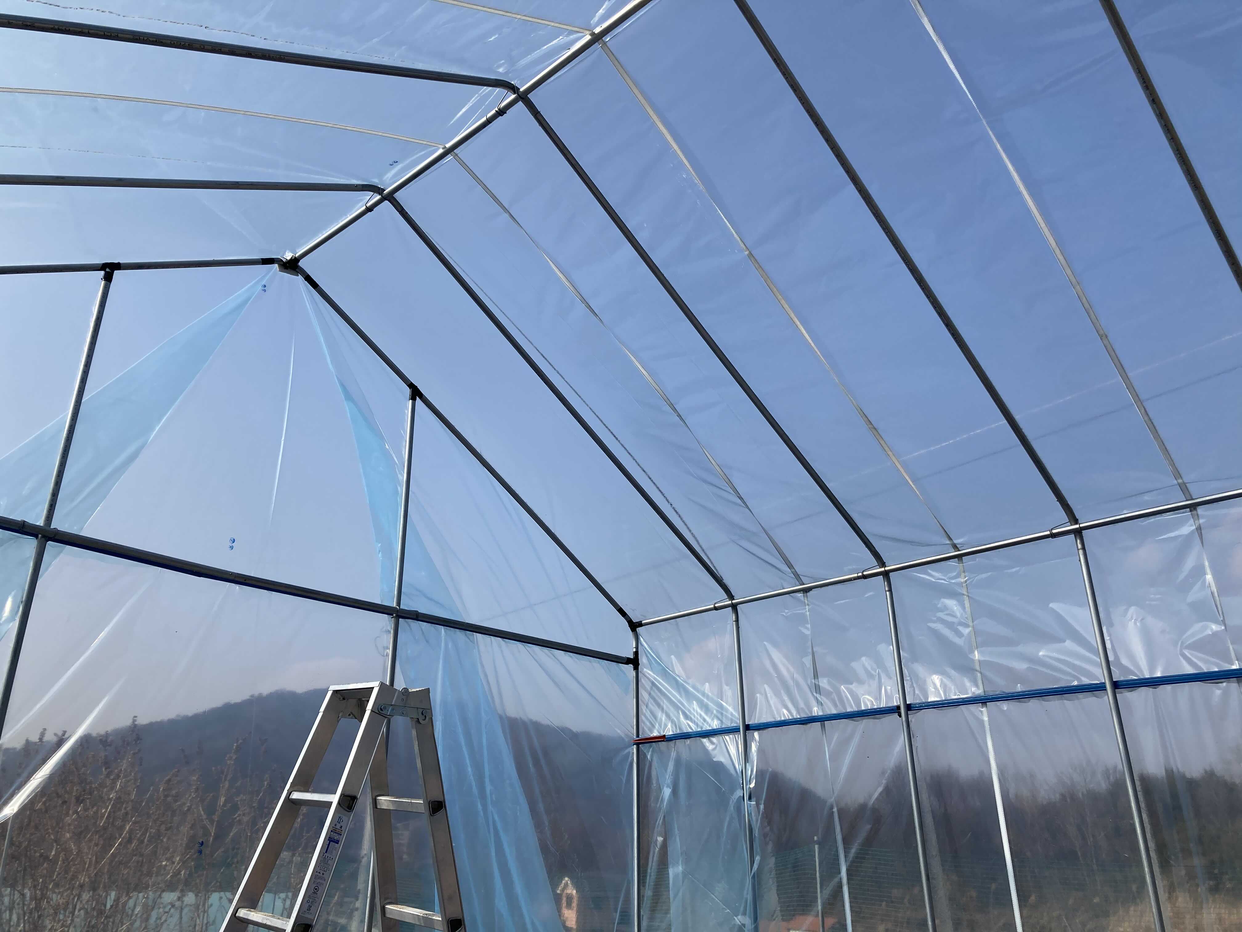 비닐하우스는 반원형이 더 비싸다더라. 모양이 예뻐서 이 집모양의 비닐하우스를 세웠다. 그런데 반원형처럼 짱짱하게 비닐이 당겨지지 않아서인지 눈에 눌려서 인지 비닐이 상당히 늘어져 있다. 남편이 따로 사다 온 끈으로 중간중간을 당겨서 벽돌로 끝을 잡아두었다. 이러기 전까지 바람에 미친 듯이 흩날려서 소란스러웠는데, 다소 조용해질 수 있었다. 시골에서 주로 사용하는 것들은 다 이유가 있다. 할머니 털 장화 같은 것도 같은 맥락이다. 처음엔 예쁘고 낭만적인 시골을 꿈꾸며 망상에 빠진 곤 했는데, 일 년이 다되어가니 점차 현실로 나오고 있다. 원형 비닐하우스 만들걸. ㅎㅎ