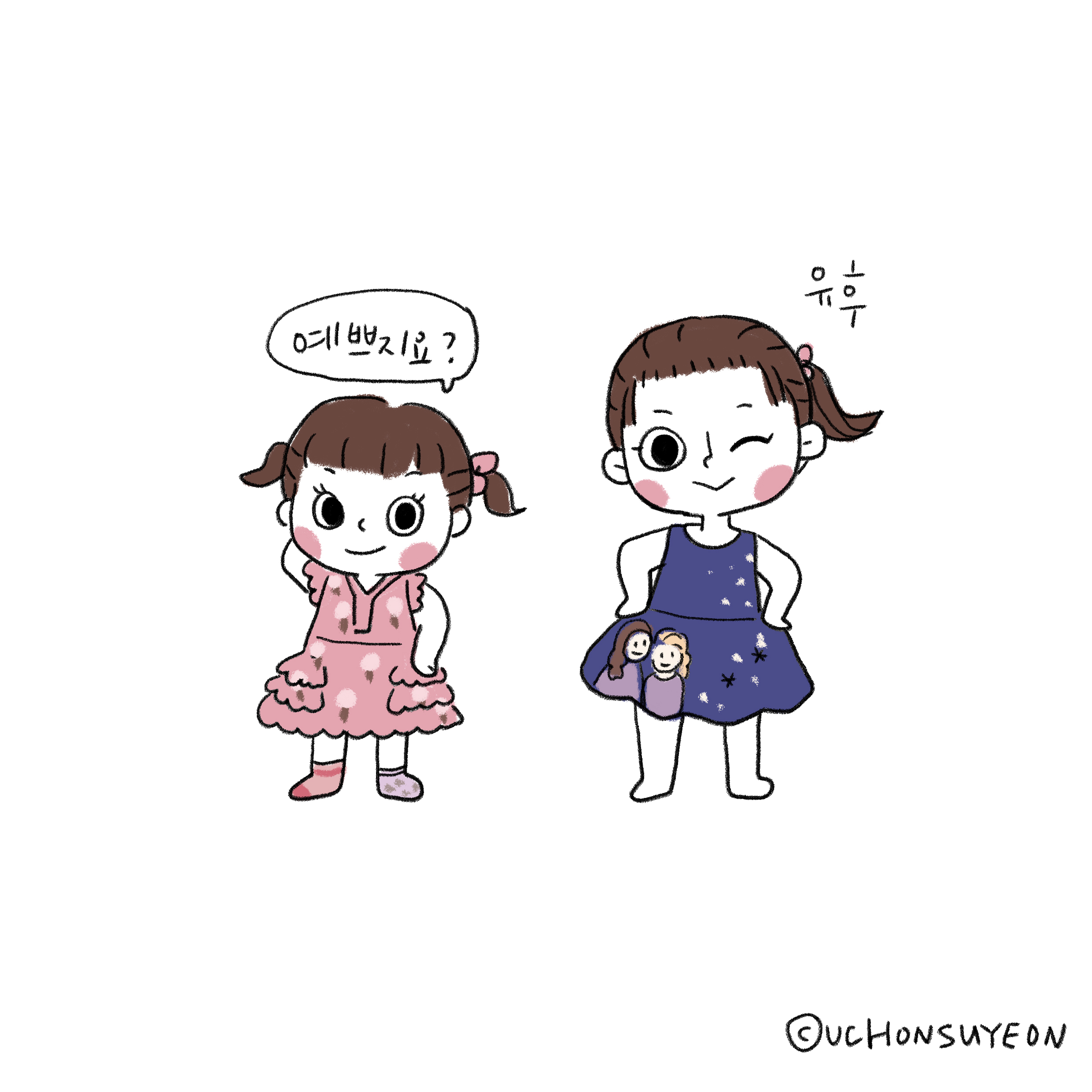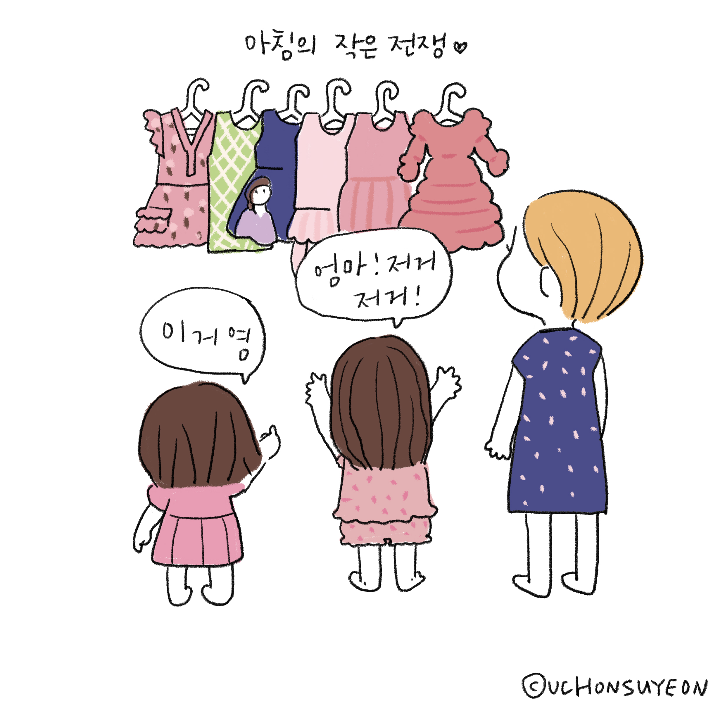 자매들은 그래요. 서로 사랑하면서도 질투하고 시기하지요. 각자 원하는 옷을 입혀놨더니 서로의 옷이 마음에 든다고 하더라고요. 허허. 그전에 분명히 물어볼 때는 싫다고 했던 옷인데 말이에요. 결국 둘이 바뀌 입고 등원했어요. 음. 그래도 한쪽만 바꾸고 싶다고 징징대는 것보다는 훨씬 낫긴 하지요. ㅎㅎ