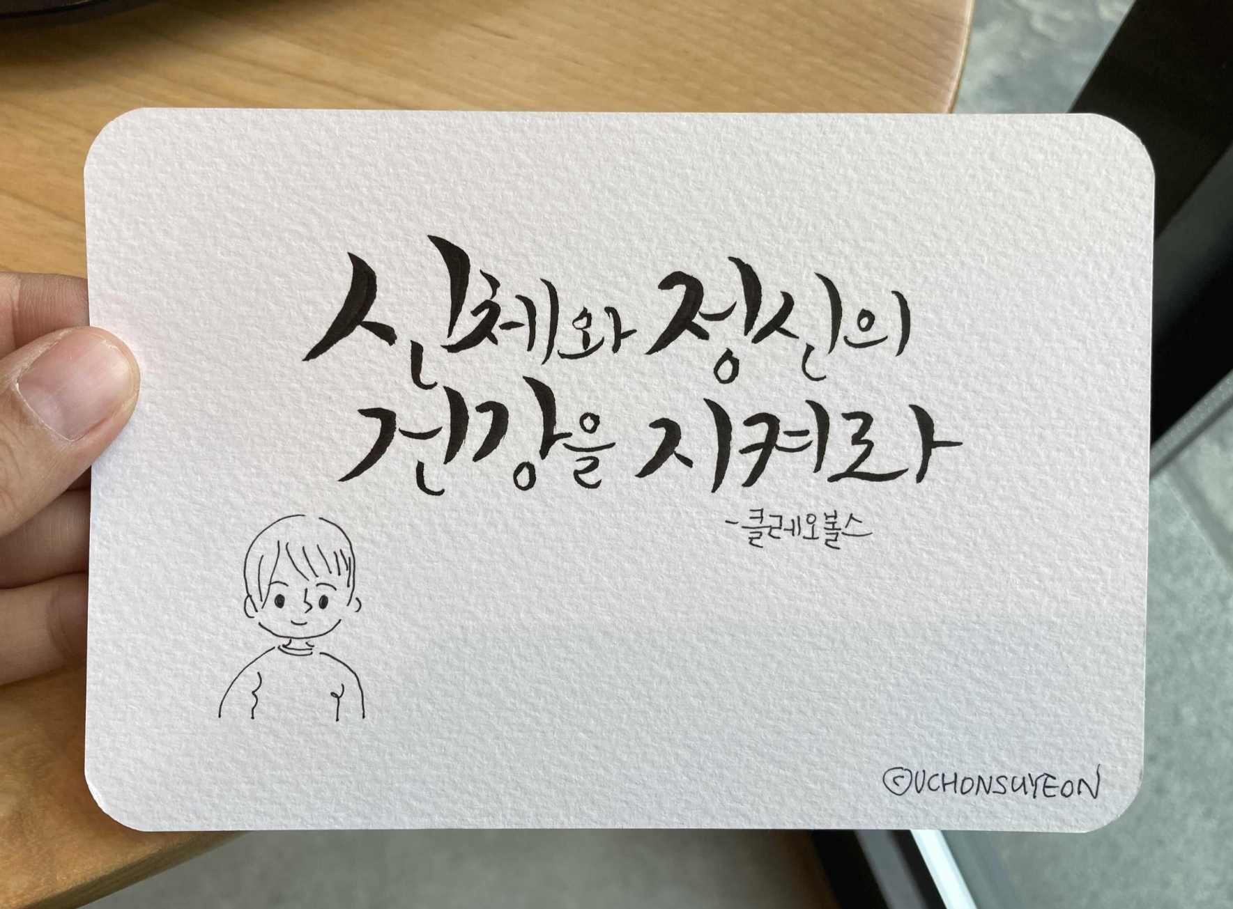 민화를 그려서 붓을 자주 잡지만 역시 캘리는 꾸준히 연습해야하는데...... 다시 목표를 세워 열심히 써야겠다. 그리고 신체와 정신의 건강을 지키면서. 나도 요근래 둘다 안좋았던 관계로 와닿는 글귀였다.
