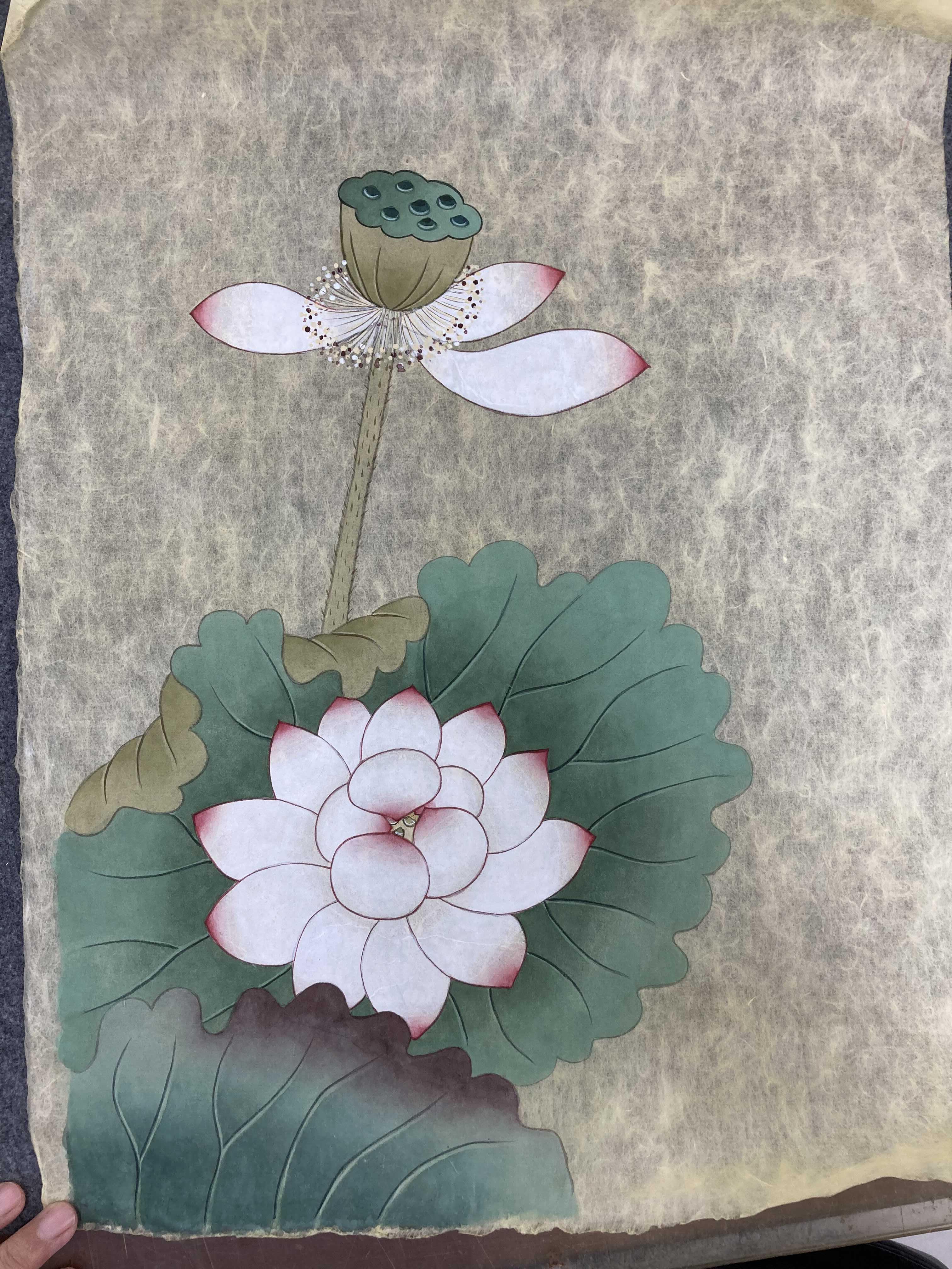 ㅋㅋ 저 다리털같은 털을.. 어쩔.... 연화도를 작게 3 점하다가 나도 그렇고 다른 사람들 그림도 대망이라 큰 그림으로 다시 그리기 시작한 거다. 연꽃그림은 수채화로도 그렸건만 민화로 그리니 생각보다 어렵다. 잘 모르니까 멍하게 아무 생각 없이 시작하고 그렸더니 망했쒔~어~ 이번 그림은 선생님 손을 많이 타서 이대로 액자화 해야겠다. ㅎㅎ 잠자리 두 마리를 그려 넣는 게 숙제다. 과연.. 잘할 수 있을지 홍홍