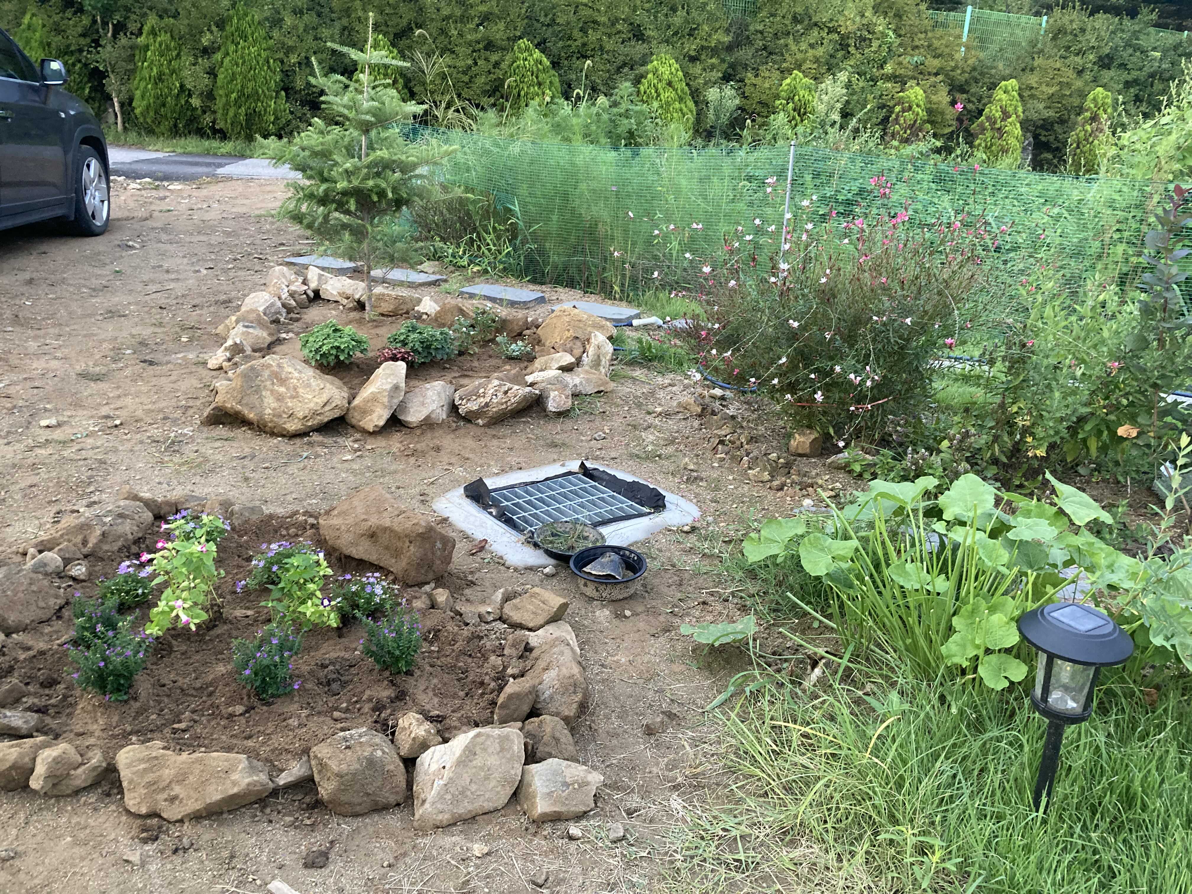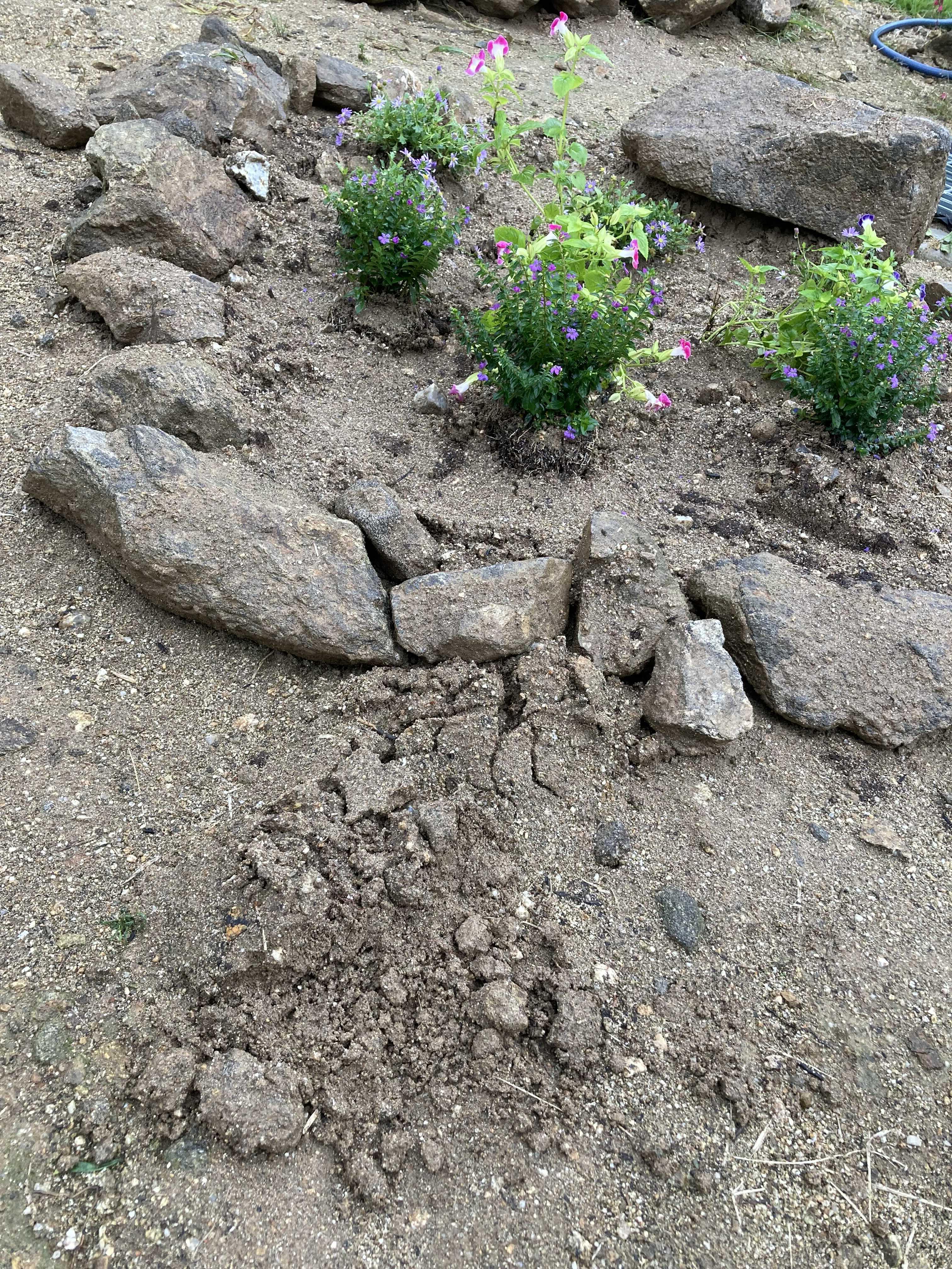 주차장 자리옆에 바위가 좀 쌓여있고 공간이 애매하게 남아서 꽃밭으로 만들기로 했어요. 발단은 남편이 '이 공간이 좀 남는데 꽃밭이나 만들지'라는 말에서 시작했고, 게으르지만 가끔은 부지런한 저는 급하게 돌을 굴려 가드를 만들고 꽃밭 자리를 만들었죠.