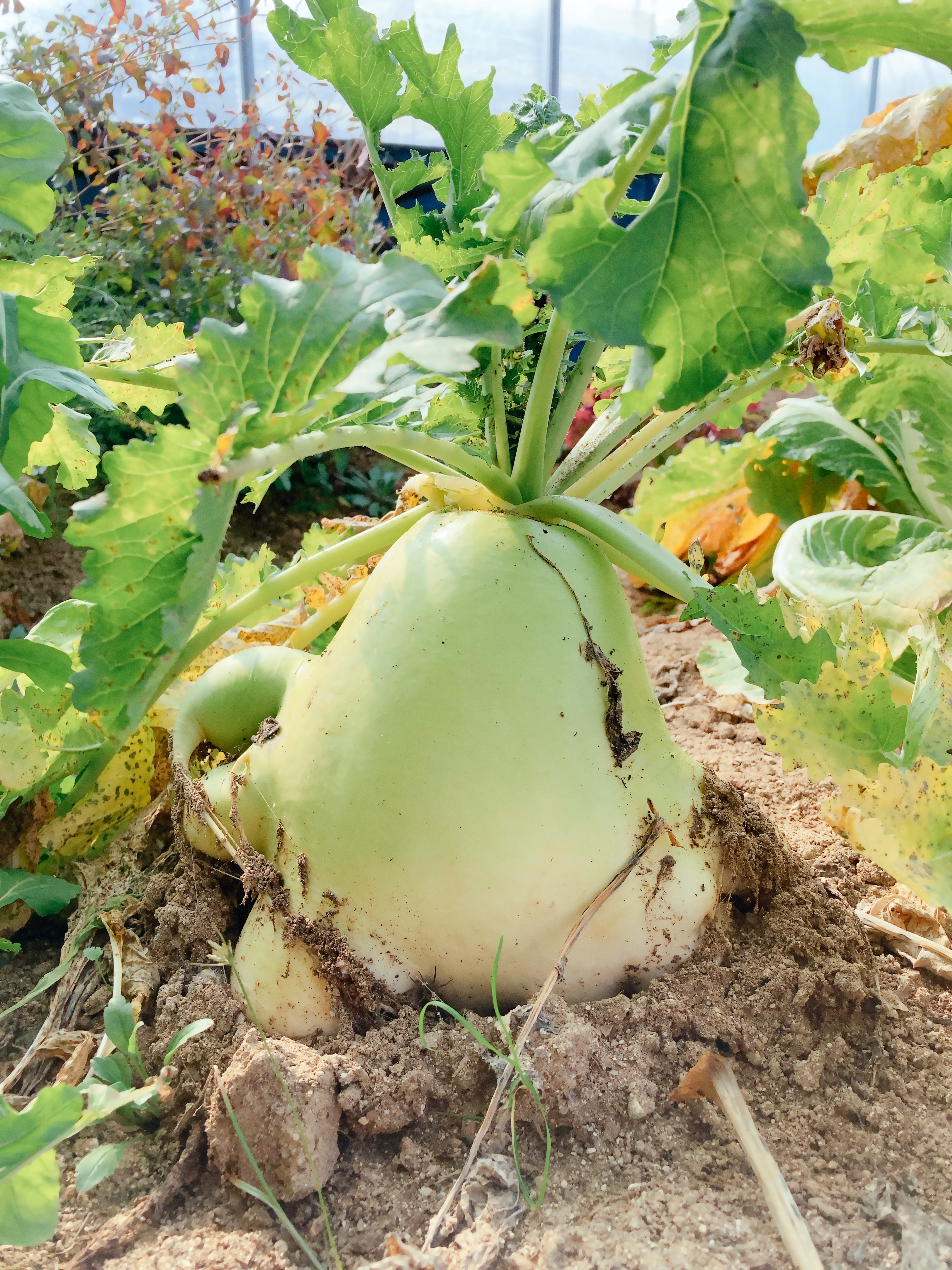 가을이 될 즈음 무와 배추 모종을 사다 심었어요. 무는 3 뿌리 배추도 3 뿌리. 그중 배추 하나는 못쓰게 되어 뽑아버렸고 나머지 애들이 무럭무럭 자랐네요. 한참 자랄 때 농막에 못 가긴 했지만, 잘 자라는 건 가끔 보아도 알 수 있죠.